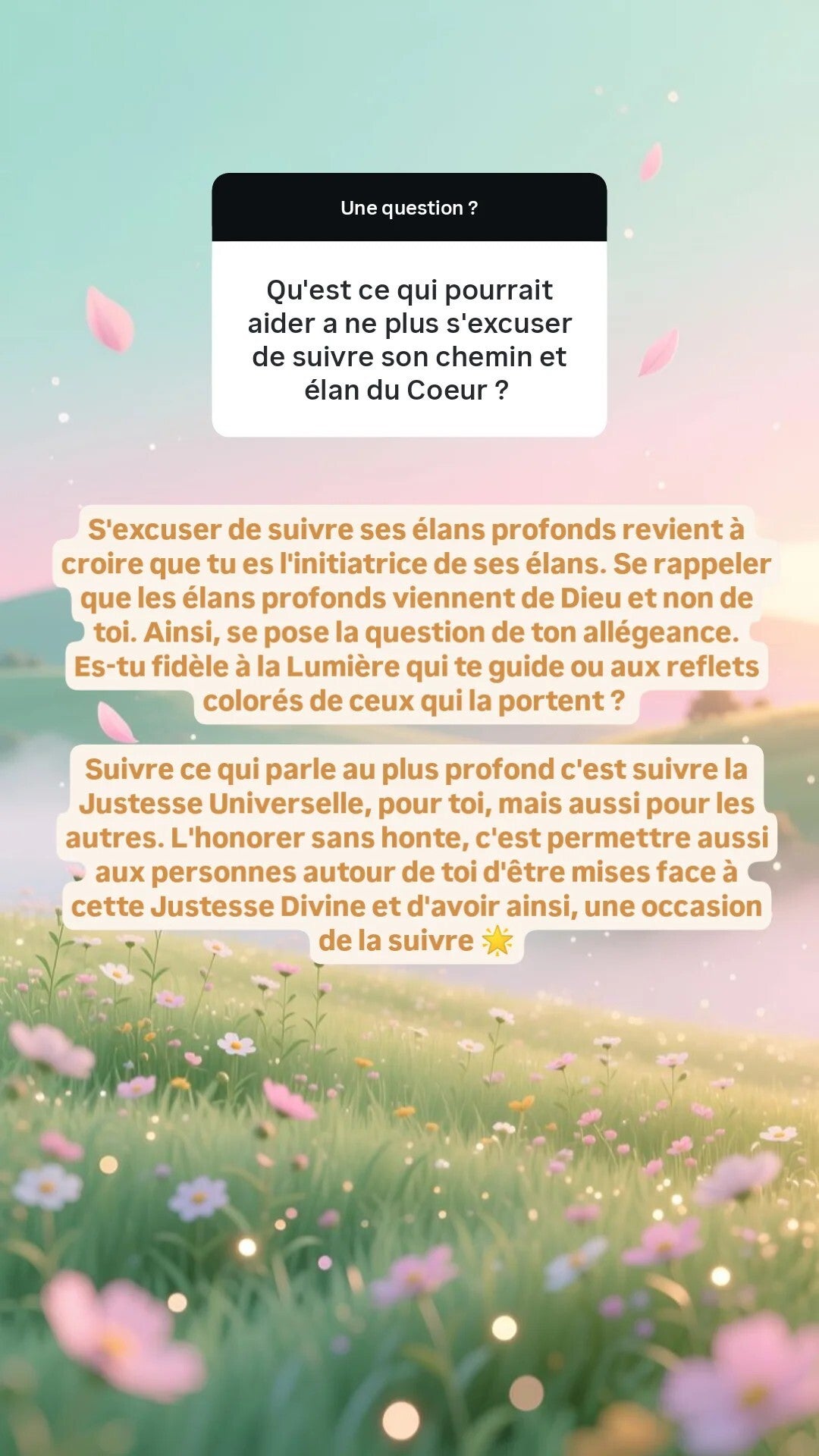 Chaque libération, chaque éclosion quotidienne est ton pain, c'est cela qui nourrit l'âme. Toutes les expériences que l'on traverse permettent d'en extraire les fruits. Le chemin peut être parcouru, non pas avec la croyance d'en atteindre un but (et donc d'obtenir une paix ultérieure, à l'extérieur de soi), mais avec un regard de découverte et d'émerveillement, dans la Foi que tout permet ton dépouillement pour qu'il ne reste que l'Amour.
