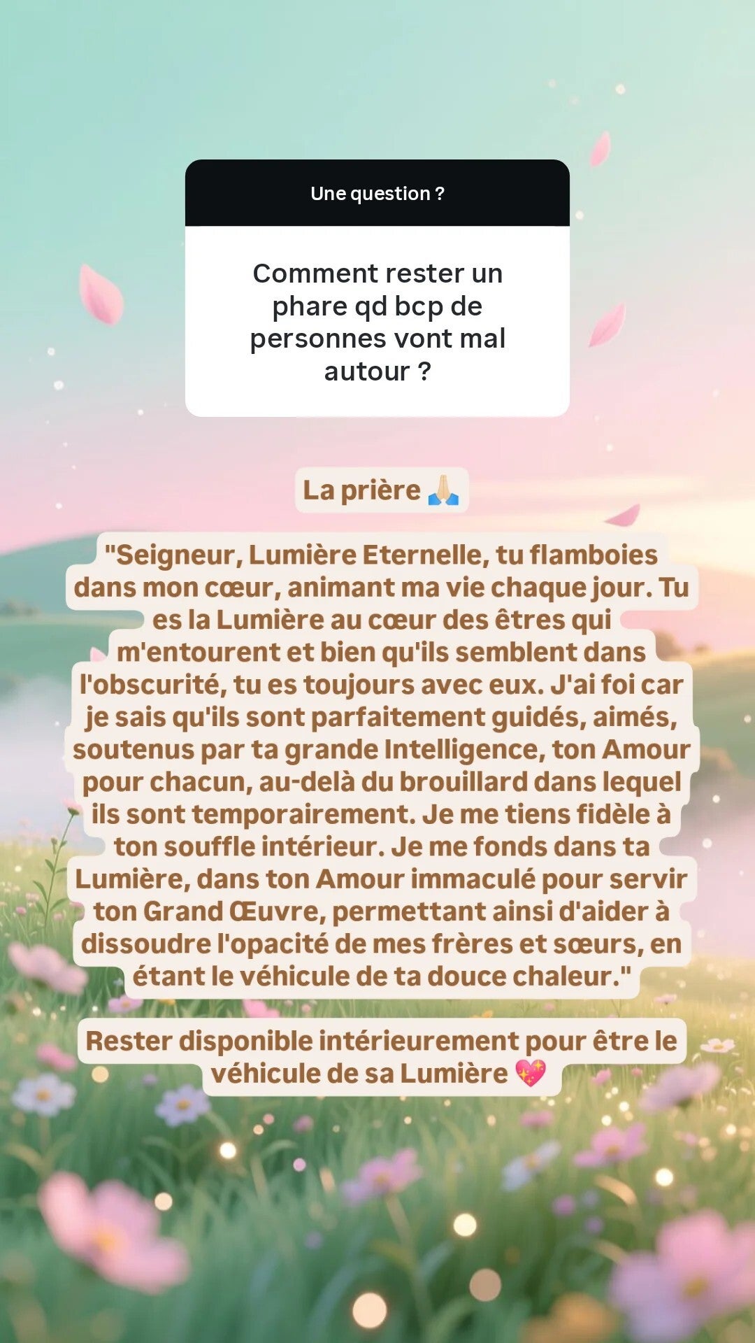 Par la clarté d'esprit de ce qui se joue, l'on peut alors s'élever au-dessus des eaux troublées. Cette lucidité, unie à la pureté de l'Amour pour l'être aimé, permet d'entrer dans la prière active. Elle est un soutien précieux qui apaise la sphère émotionnelle, en offrant ce qui nous pèse. En ayant conscience de l'enseignement qui se dévoile pour l'être cher au travers de son épreuve, la prière devient acceptation et gratitude. Elle agit alors comme une offrande du Cœur, un pont d'Amour entre la personne en souffrance et l'Éternel.